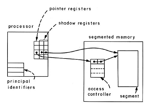 Fig. 11. Use of "shadow" capability registers to speed up an access control list system. When a pointer register containing a unique identifier is flrst wed, the shadow register is automatically loaded from the access controller to which the unique identifier refers. Later wes of that pointer register thw do not require reference to the access controller. Storing of a pointer register means storing of the unique identifier only; the shadow register is never stored. |