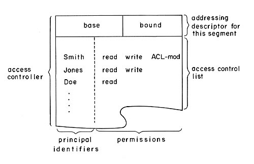 Flg. 12. The access controller extended for self contained control over modification of its access control list. In this example, user Smith has three permissions: to read and to write into the associated segment, and to make modfications to the access control list of this access controller. Jones cannot modify the access control list, even though he can read and write in the segment described by this access controller. Doe is even more constrained. |