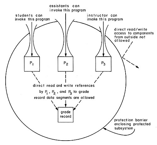 Fig. 14. A protected subsystem to implement the grade-keeping system described in the text. P1, which can be invoked by all students in the subjoct, is programmed to return the caller's grade for a particular assignment or the distribution of all grades for an assignment. P2 which can be invoked by the teaching assistants for the subject, is programmed to allow the addition of new grades to the record but to prevent changing a grade once it is entered. P3, which can be invoked only by the instructor, is programmed to read or write on request any data in the grade record. |