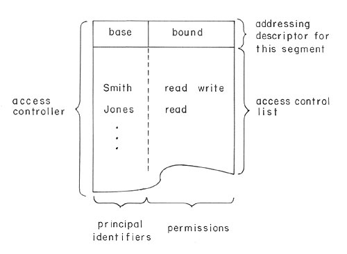 Fig. 8. Conceptual model of an access controller. When a virtual processor attempts to refer to the segment associated with the access controller, the memory system looks up the principal identifier in the access control list part. If found, the permissions associated with that entry of the access control list, together with the addressing descriptor, are used to complete the access. |